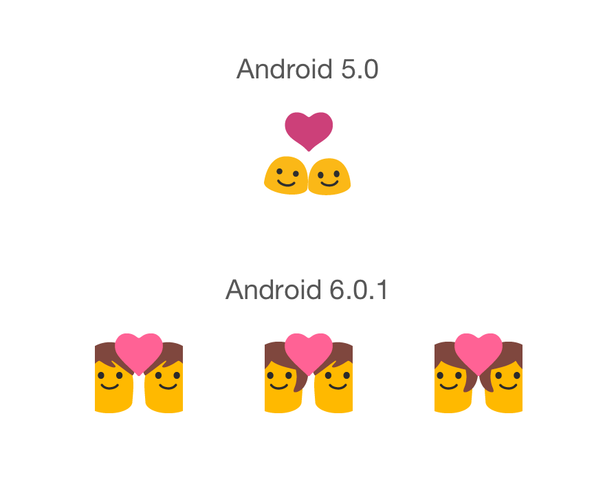 Above: The gender-neutral couple emoji of Android 5 has been replaced with three couple options.