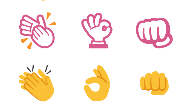 All hand gestures are no longer pink, and now use the default-yellow skin tone matching the human and smiley characters.