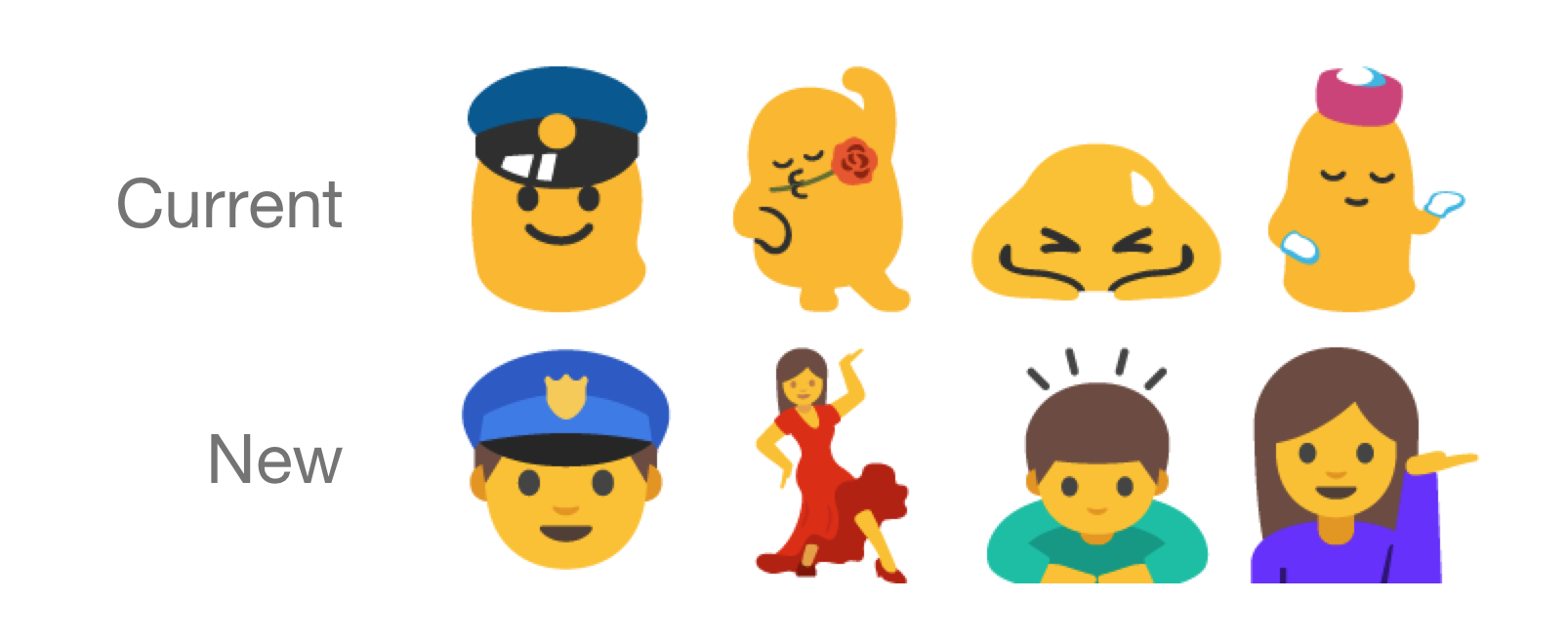 A current Unicode specification intends to introduce tags for gender, allowing any emoji to be specified as male, female, or gender-neutral. If this goes ahead, we could well see a return of the blobs in a future update.