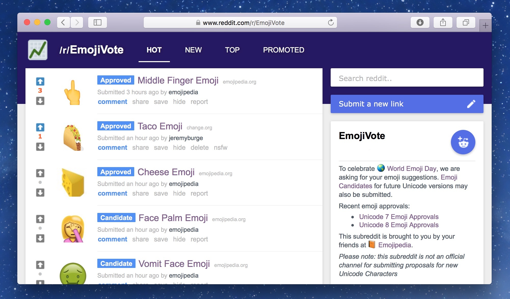 To celebrate World Emoji Day, we have created EmojiVote. This is a subreddit moderated by Emojipedia, for the sole purpose of measuring interest in new emoji suggestions from the public.