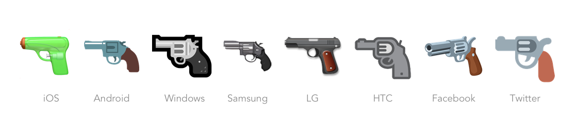 All other vendors[3] display this emoji as a real gun. Even if they all decided to follow-suit and change to a water or toy gun (which could happen, if Apple sticks with this), the change would take a considerable amount of time.