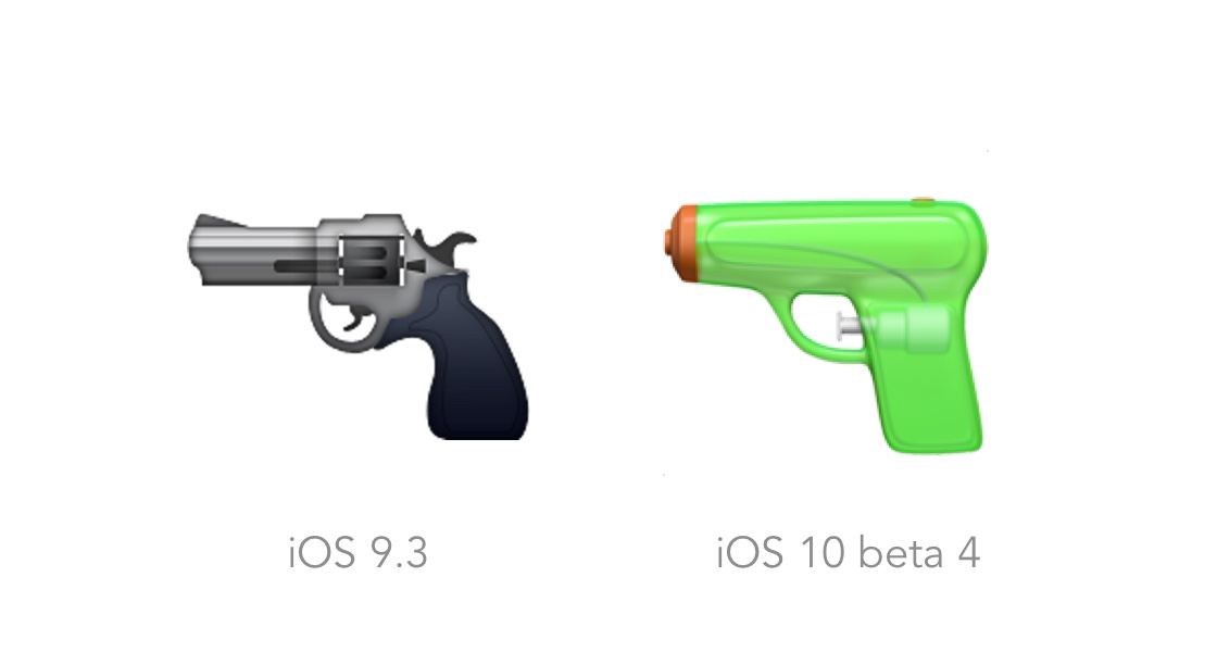 🔫 Pistol emoji has changed from a realistic-looking gun in iOS 9.3 to a bright green toy water gun in the iOS 10 beta.
