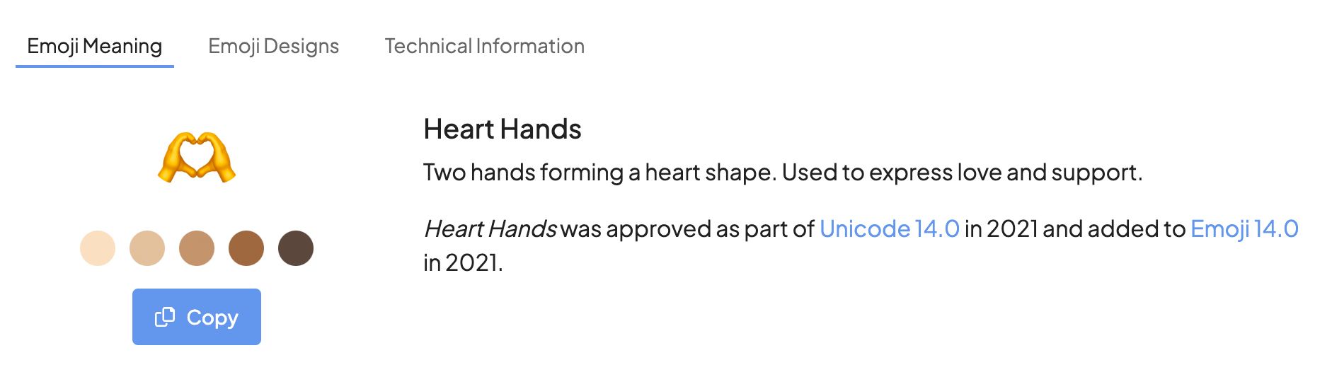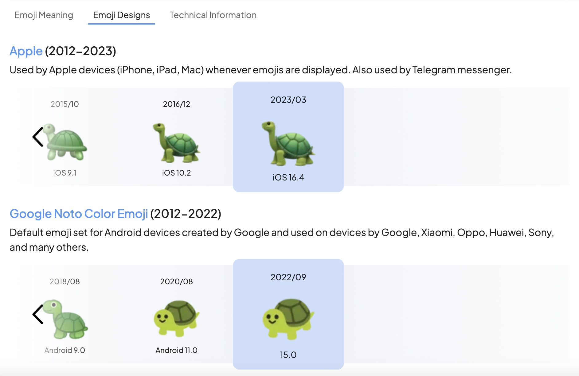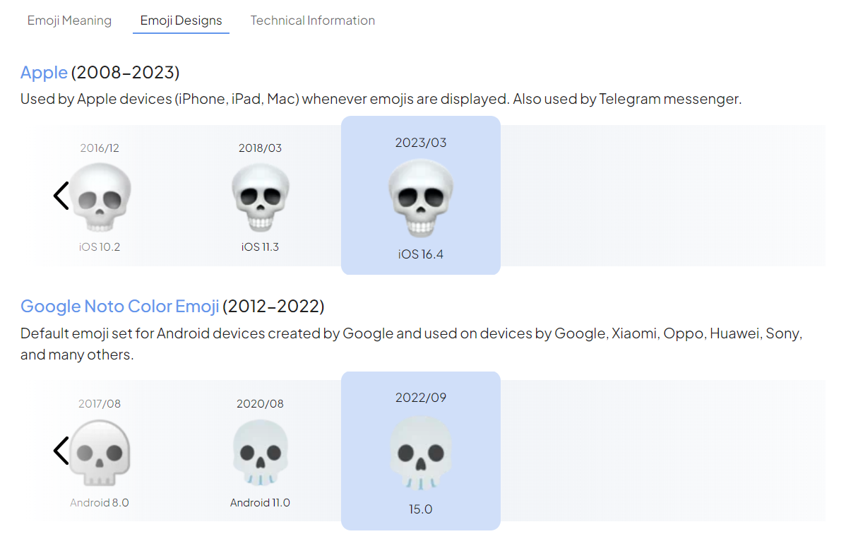 Selecting 'Emoji Designs' will show you an improved display of that emoji's designs not just across different vendors like Apple, Google, and Microsoft, but also across different vendor updates where that emoji was added or updated.