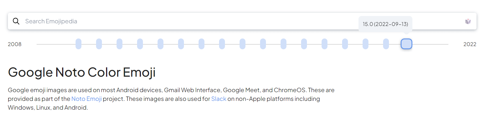 So, the notches on the timeline shown each represent an update to the Google Noto Color Emoji set that is available within the Emojipedia archives (plus a bonus animated Gmail set from 2008).