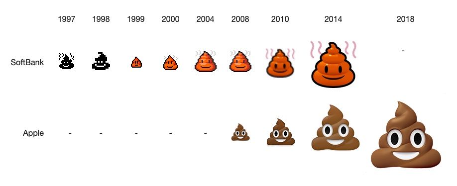 - Apple's emoji set was derived from SoftBank (which may have been the first platform with the 💩)