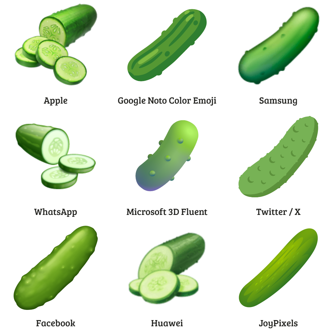 In each of the above instances, several vendors represent the proposed new emoji concept (e.g., a pickle) instead of the actual intended depiction (e.g., a 🥒 Cucumber).