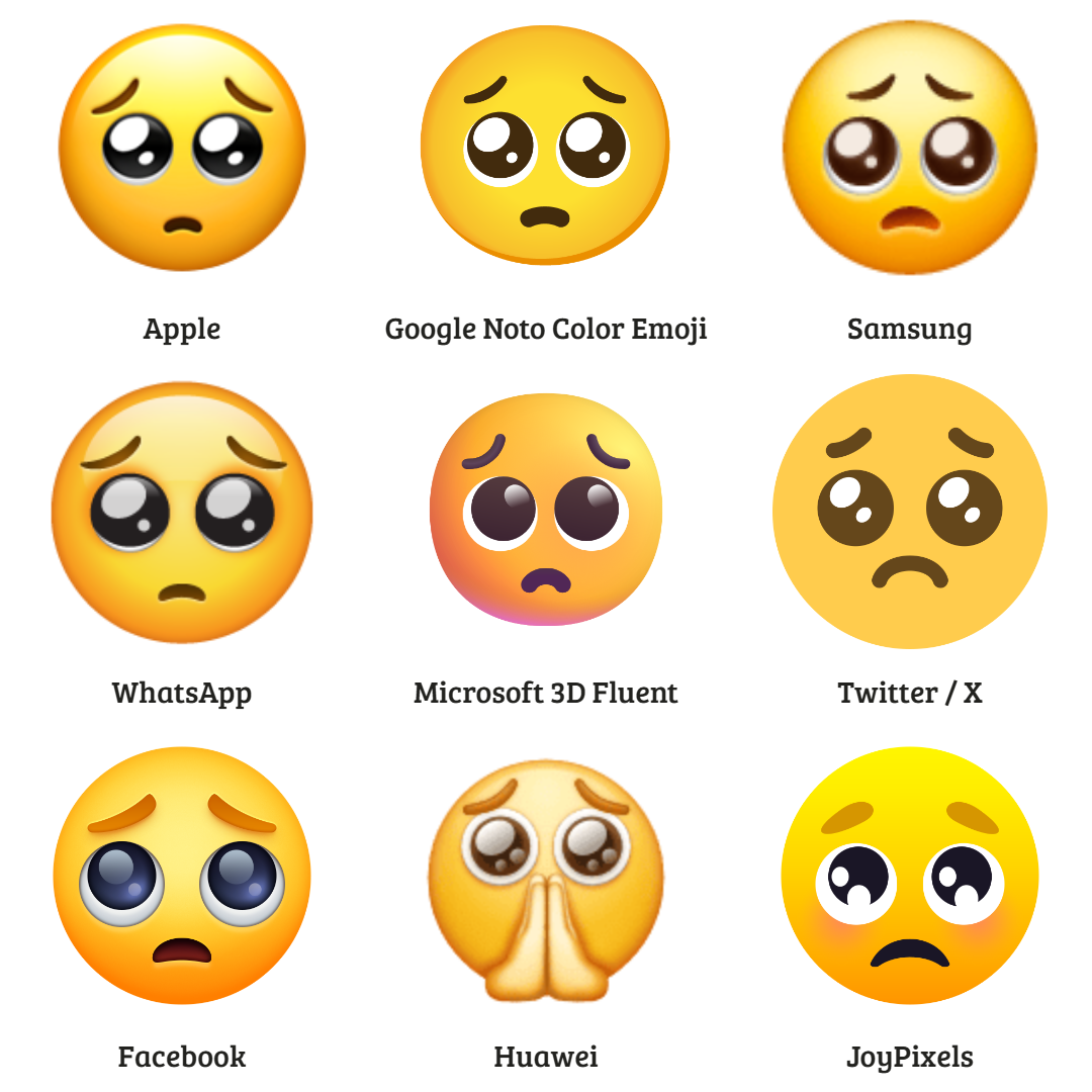 Many of Huawei's emoji designs contain attributes that are not shared by other vendors, such as the folded hands within the 🥺 Pleading Face emoji design shown below.