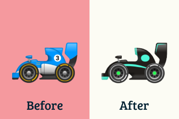 Additionally, in a so-far unique case, April 2024 saw WhatsApp update the 🏎️ Racing Car emoji design displayed on Android devices as part of a joint marketing campaign by WhatsApp and the Mercedes-Benz F1 team.