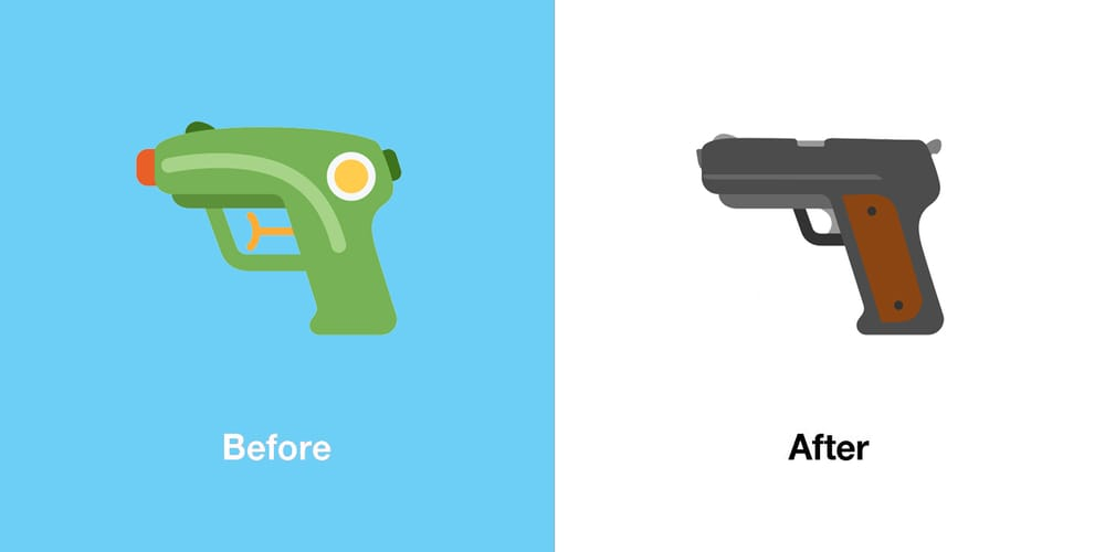 Originally depicted as a realistic firearm across almost all major platforms, Apple’s 2016 decision to redesign this emoji as a bright green water pistol proved to be a turning point.