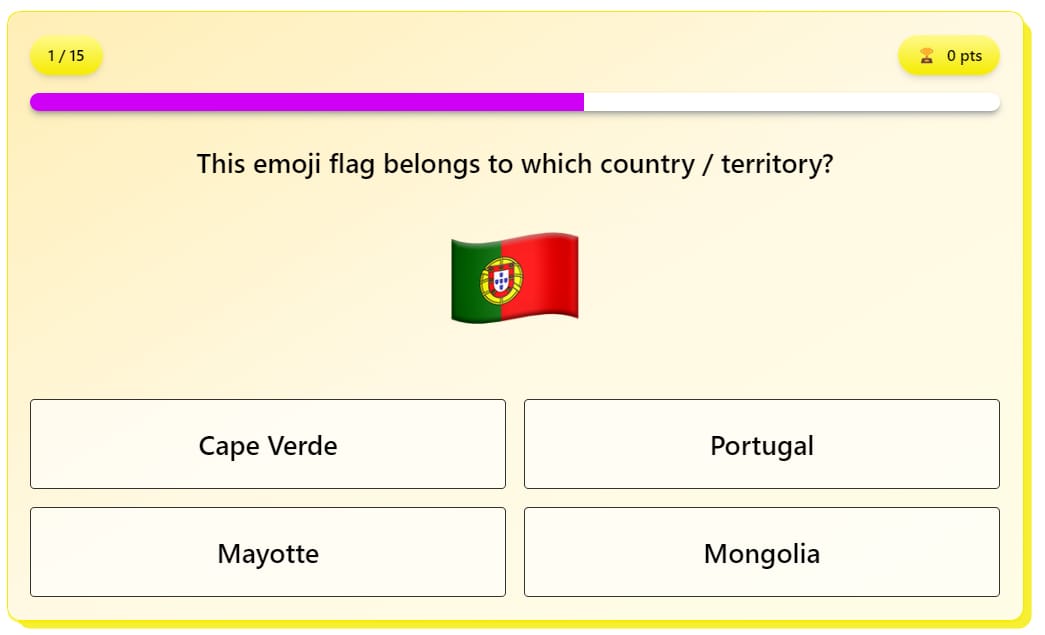 - Guess the Flag (๐๐๐๐๐ฎ): A classic quiz game where you're asked to name the country or territory a particular emoji flag design is representative of.