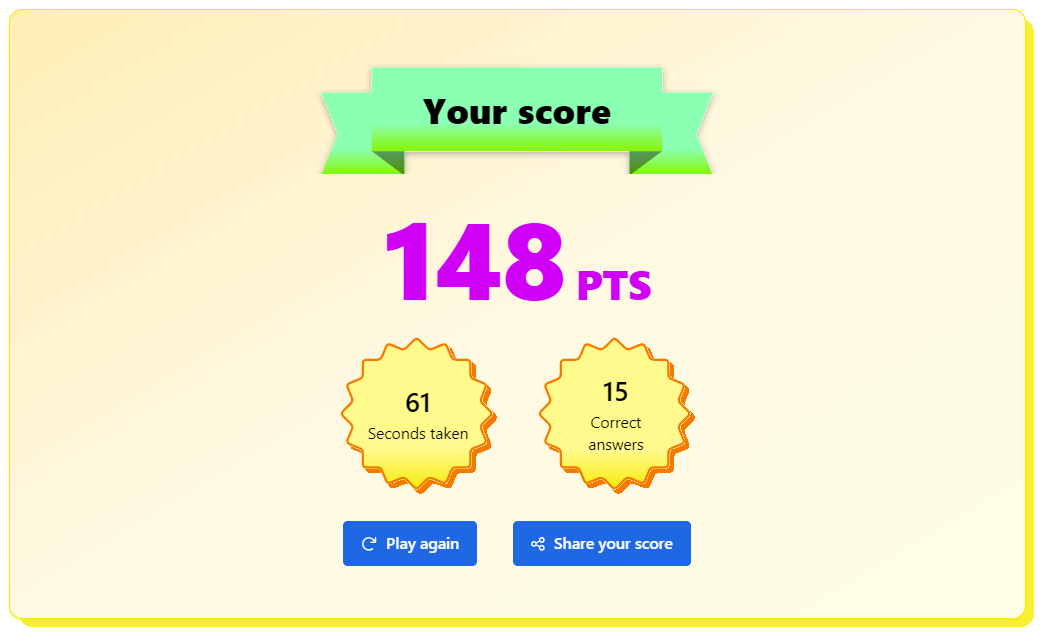 The faster you provide the correct answer, the more points you'll be rewarded for that question - and after a total of 15 questions, you'll be given your total score and be informed if that score merited a position on our daily leaderboards.