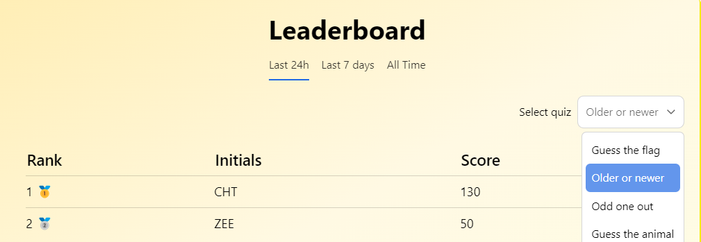 Our leaderboards also include "Last 7 Days" and "All Time" toggles, as well as easy access to the leaderboards of the other quiz games.