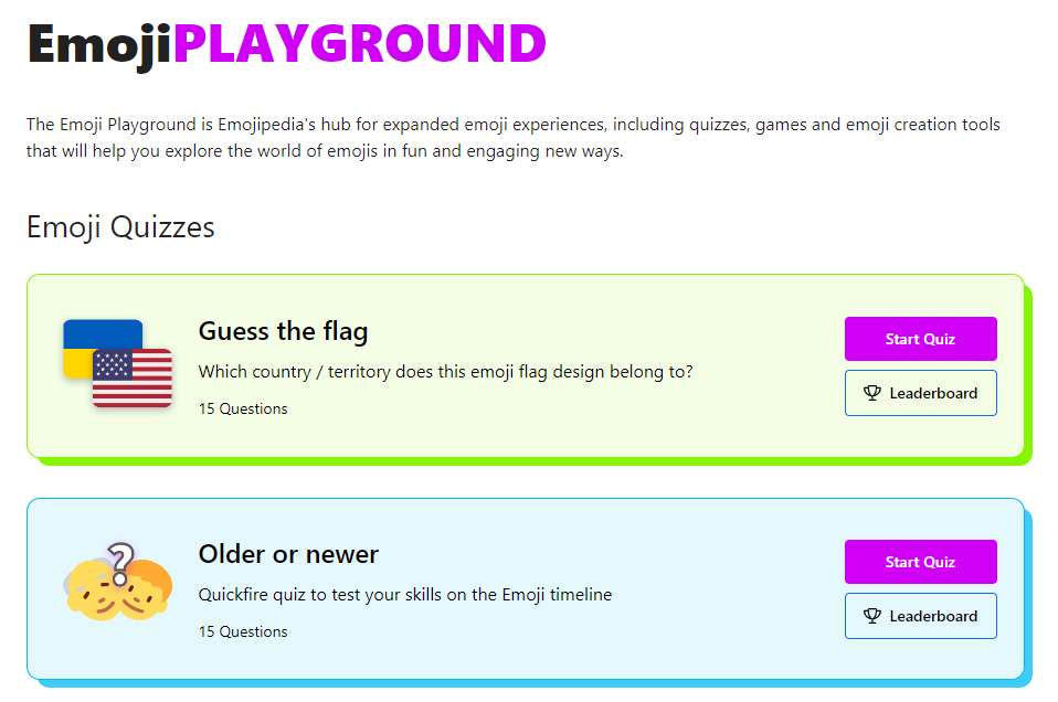 Today, in celebration of our 11th annual World Emoji Day, we here at Emojipedia have launched a brand new section of our site: the Emoji Playground. Debuting with a selection of emoji quiz games alongside the classic Emoji Mashup Bot, the Playground will be our experience hub for an ever-expanding series of emoji-based games and image creation experiences.