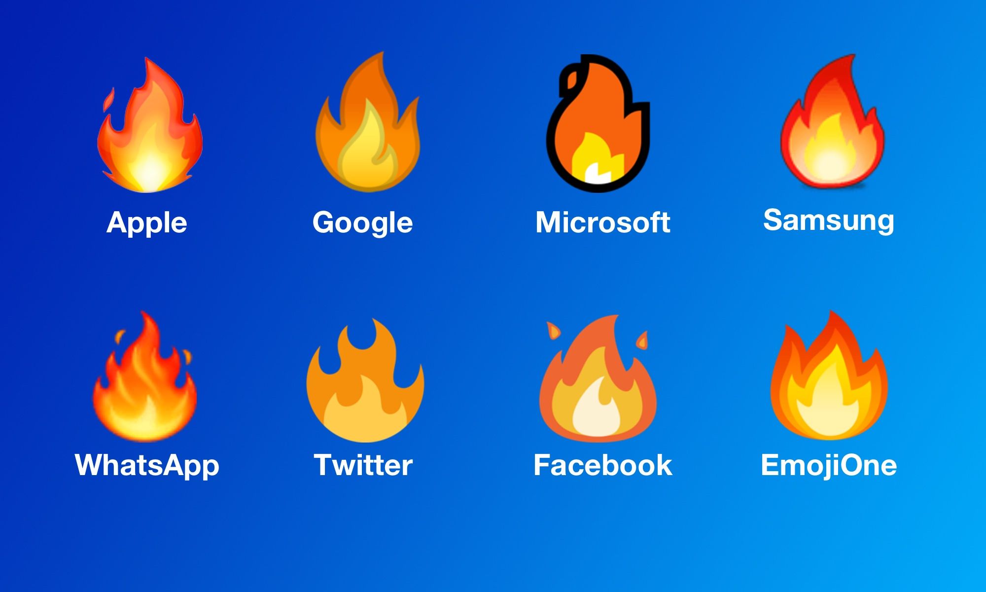Its appearance over time has also mostly been uniform, too. For iOS 10.2, Apple updated its π₯ Fire to look more realistic than its slightly cartoonish predecessor. Microsoft, for its Windows 10 Anniversary Update, gave its previously flat yellow π₯ Fire some reddish-orange depth, more in line with Appleβs look.