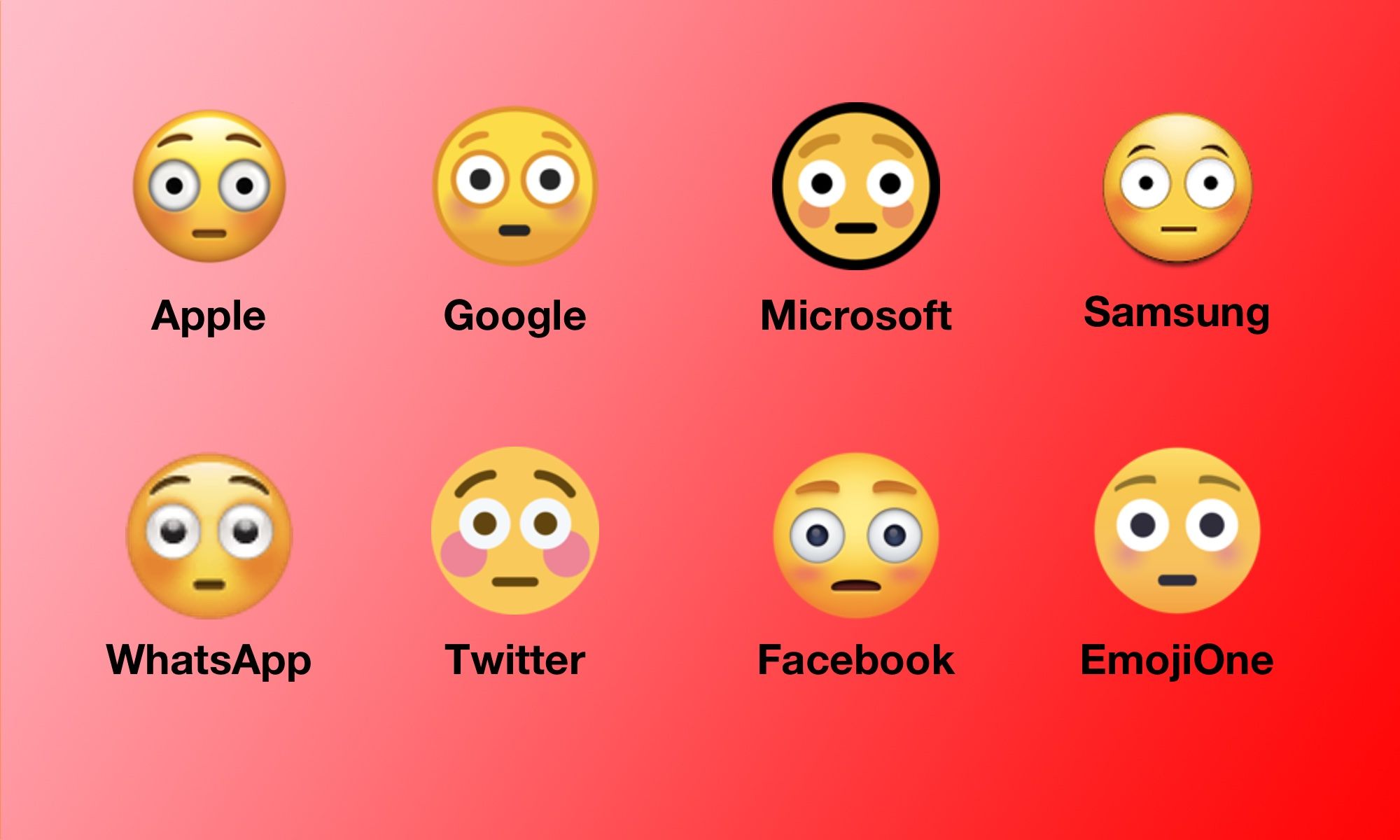 The updates from Microsoft, Google, and Samsung cemented a convergence in form for 😳 Flushed Face, reducing confusion and misunderstanding as it appears across major platforms—but not necessarily a convergence in its meaning. Its platter-sized eyes and sky-scraping eyebrows suggest astonishment, but its burning cheeks and pinched lips appear at once abashed and alarmed, flustered and fearful. This mix makes for a lively and colorful expression, and interpretations of it are many.