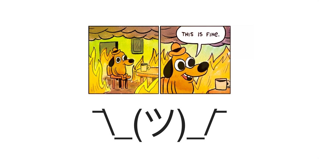 That keeping-it-together-while-the-world-burns sentiment, very much a part of the internet zeitgeist in the late 2010s, is popularly represented by KC Green's "This is Fine" comic and subsequent memeโto which ๐ Upside-Down Face has also been compared.