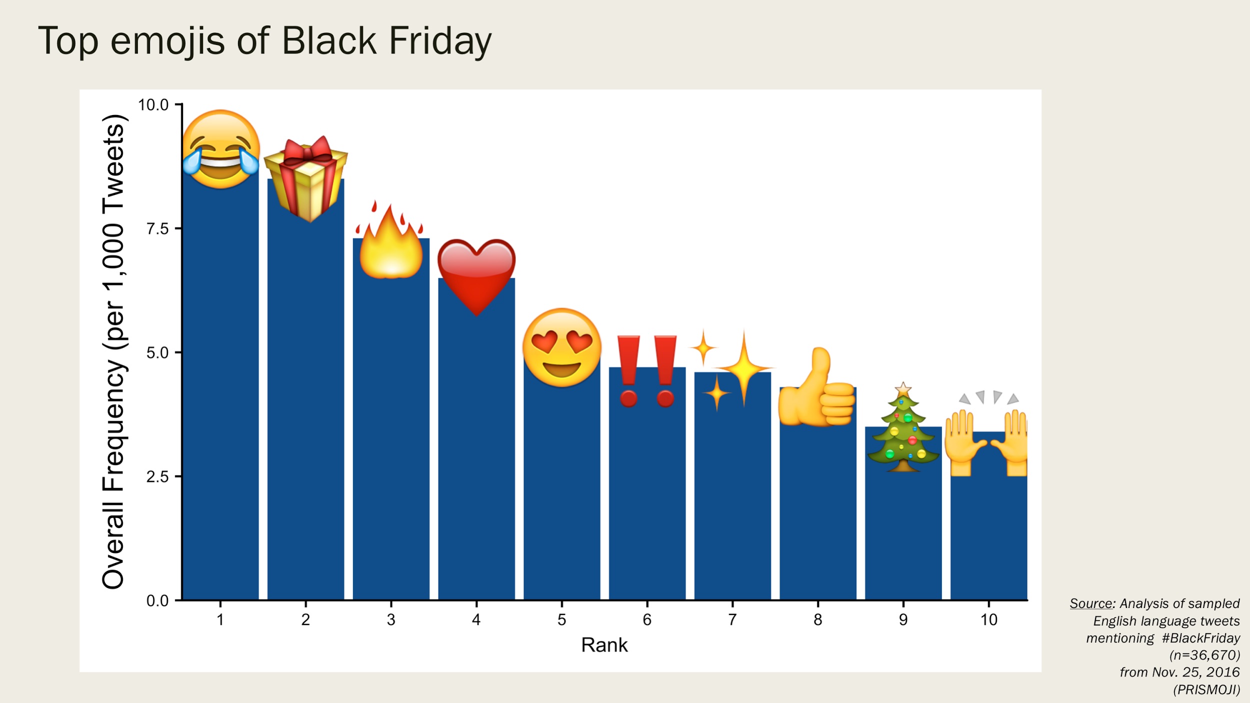 😂 Face with tears of joy was the top emoji in Black Friday related tweets, and it outranked ❤️ heart and 😍 heart eyes suggesting sentiment about Black Friday may remain more skeptical than warm and loving.
