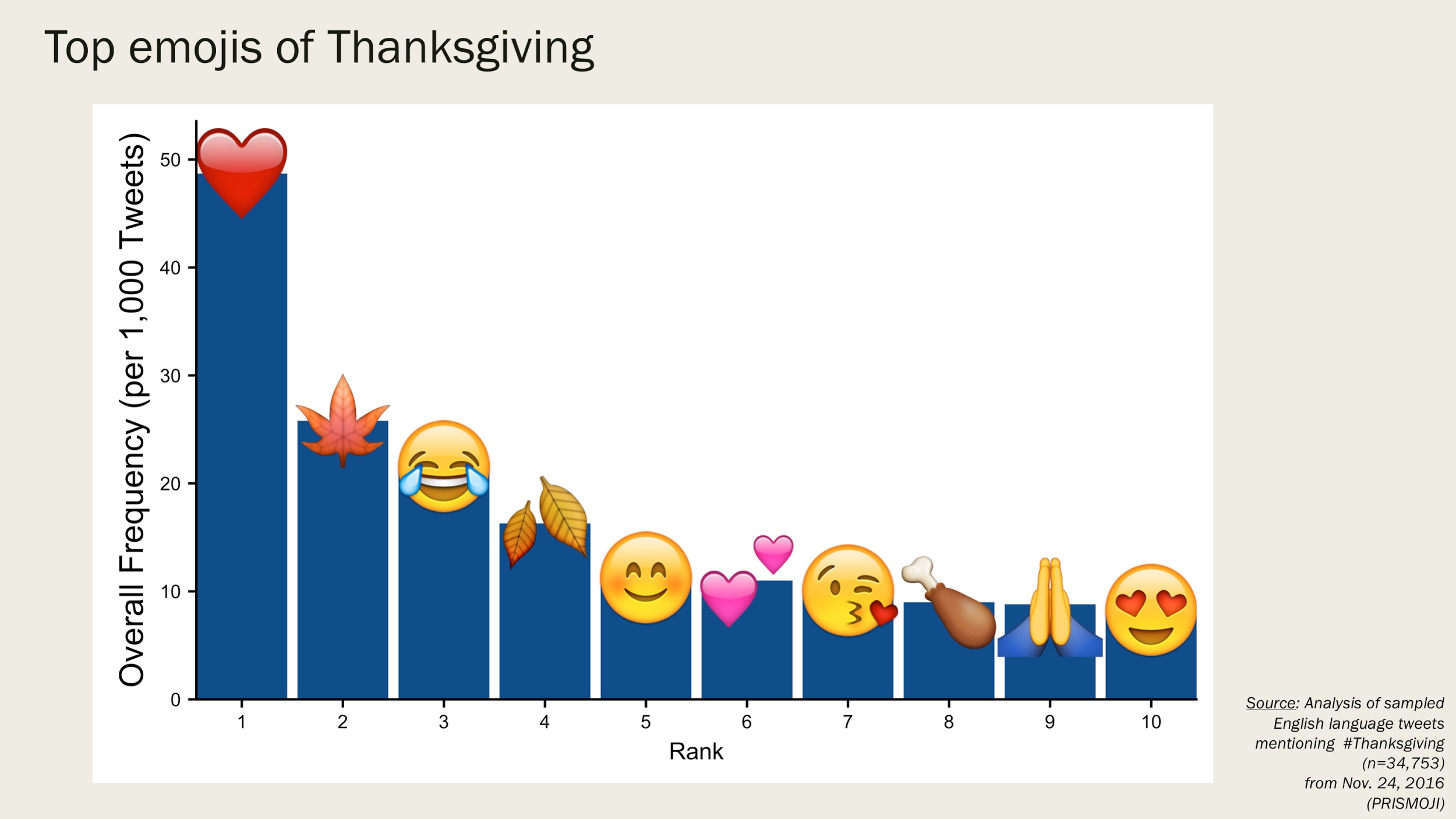 We also found that seasonal fall emojis such as 🍁 maple leaf and 🍂 fallen leaf as well as 🍗 poultry leg have been popular.