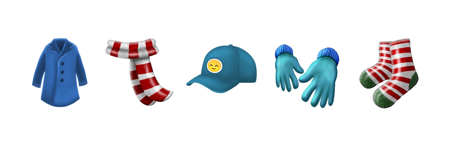 The current emoji clothing collection lacks many warmer items. This update provides various winter clothes such as a coat, scarf, and gloves.