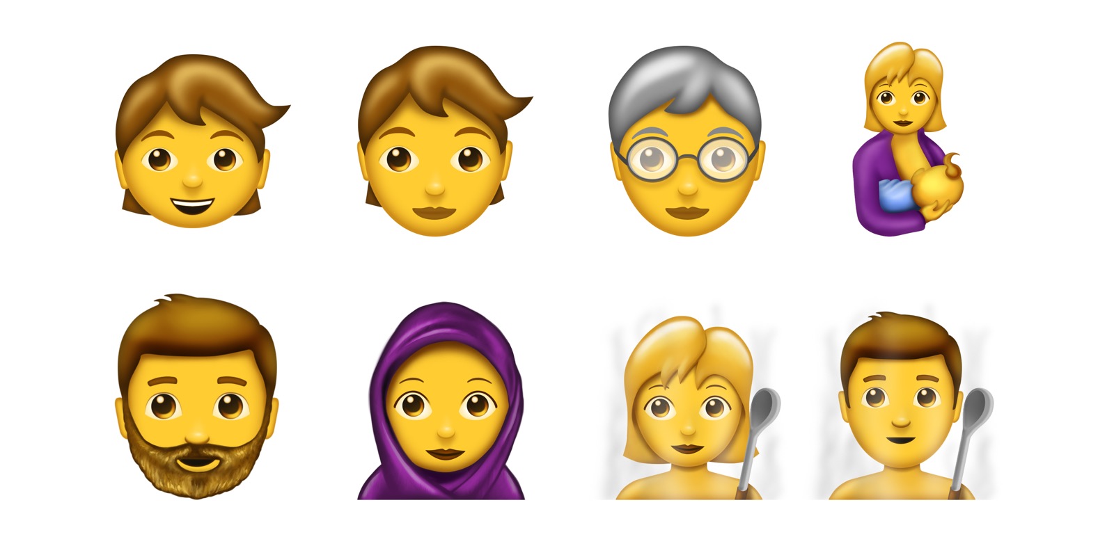 Additionally, no gendered versions of Breast-Feeding, Bearded Person, or Person With Headscarf are in this release.