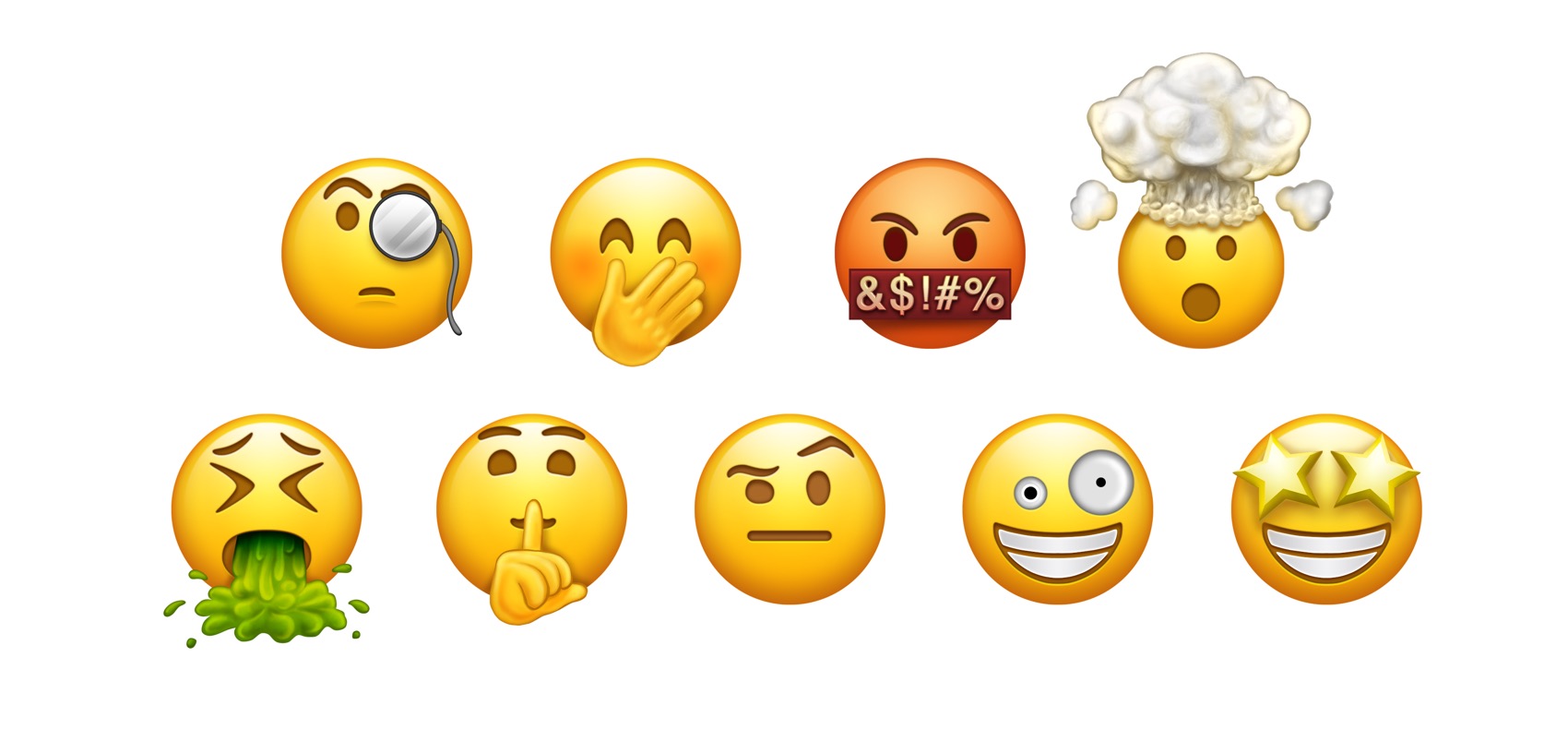 Smileys in this update include a monocle wearing face, a cheeky hand-over-mouth, swearing, "mind blown", vomit, shhhh, eyebrow-raise, wild eyes, and star eyes.