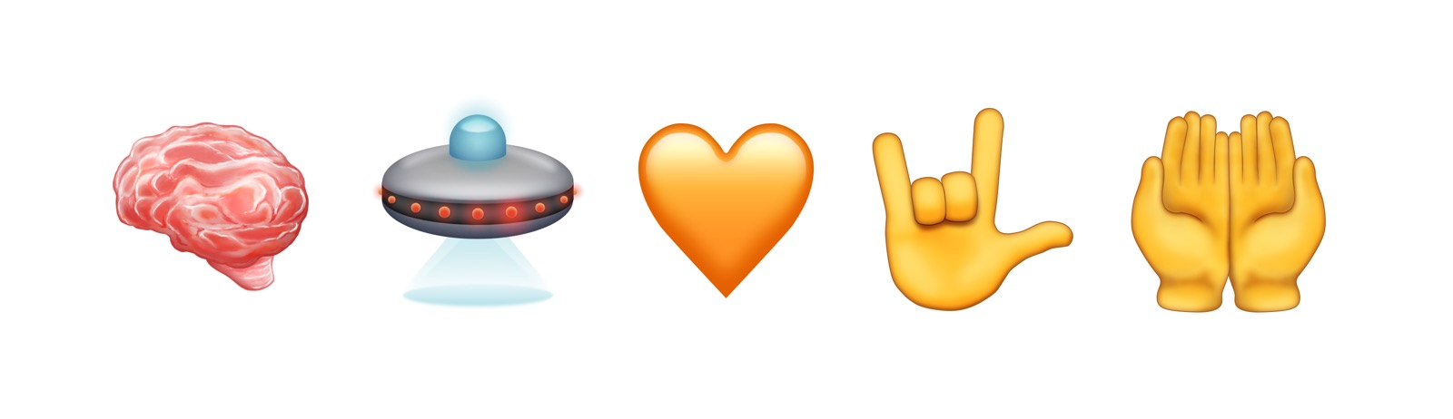 A brain, flying saucer, Orange Heart (to complete the rainbow of colored hearts), and two new hand gestures round out this release.