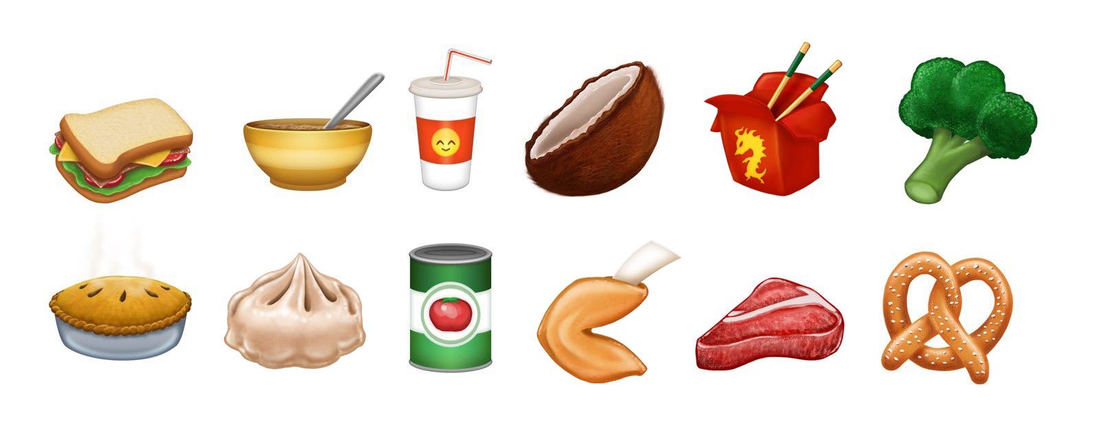 Above: New food and drink emojis include a sandwich, coconut, and pie.