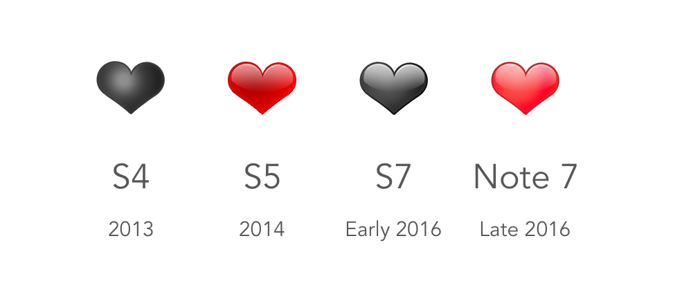 Presenting the evolution of the ❤️ Heavy Black Heart emoji on Samsung phones 2013—today: