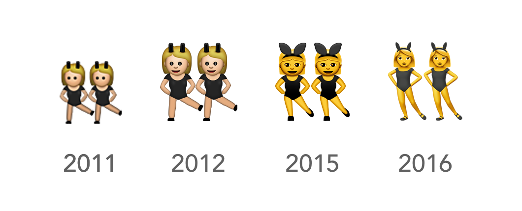 Apple hasn't been known to change the appearance of its emoji characters frequently, but it does happen. The ๐ฏ Woman With Bunny Ears is now on her fourth iOS update: