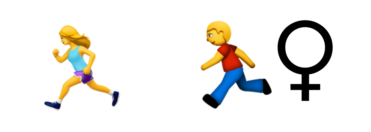 Above: Woman Running (left, iOS 10) falls back to ๐ Runner emoji + โ Female Sign (right, iOS 9) on systems without gendered emoji support.
