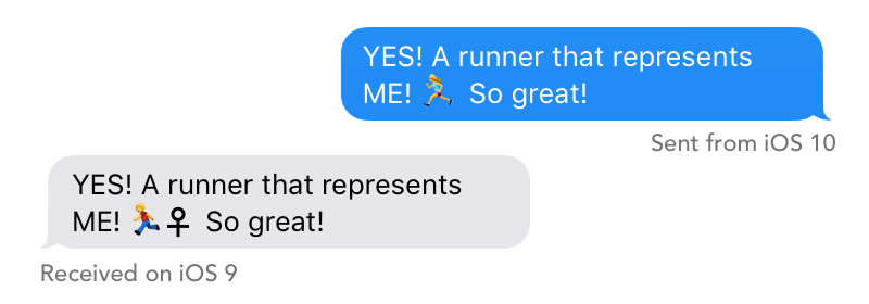 Sending, for example, the ๐โโ๏ธ Woman Running Emoji to an iOS 9 user, or someone on another platform, looks like this: ๐โ