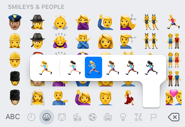 New gendered emoji options are displayed on the emoji keyboard, with male and female versions of most existing emojis now provided: