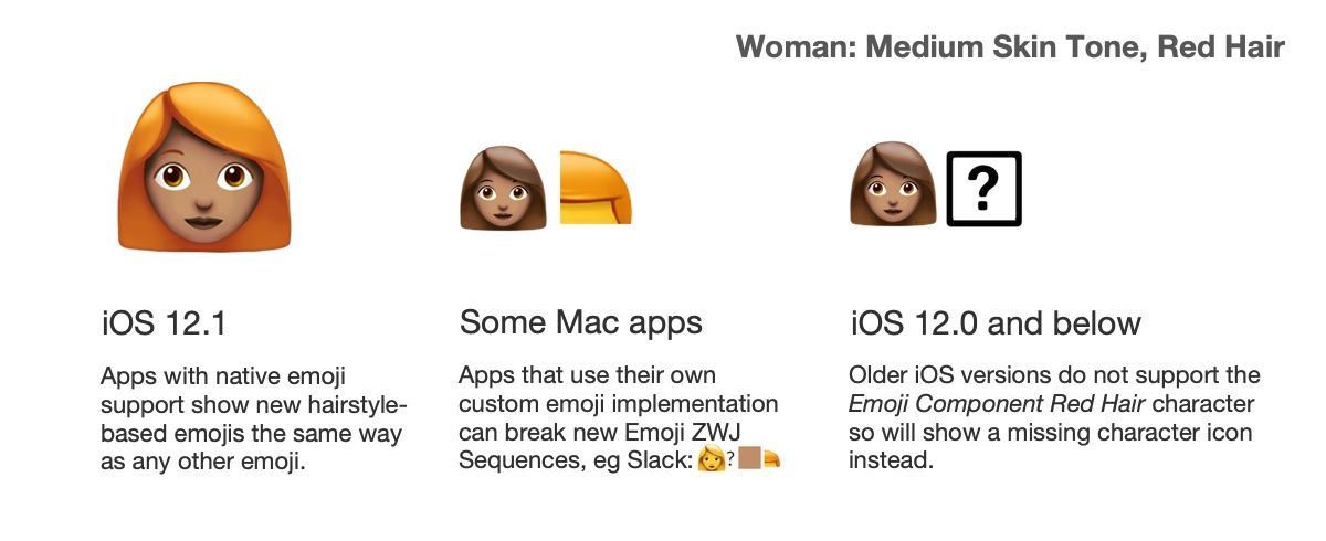 On iOS 12.1 these new hair options work in exactly the same way as any emoji, however when sending to users on older systems or with apps that attempt custom emoji implementations the individual characters may show.