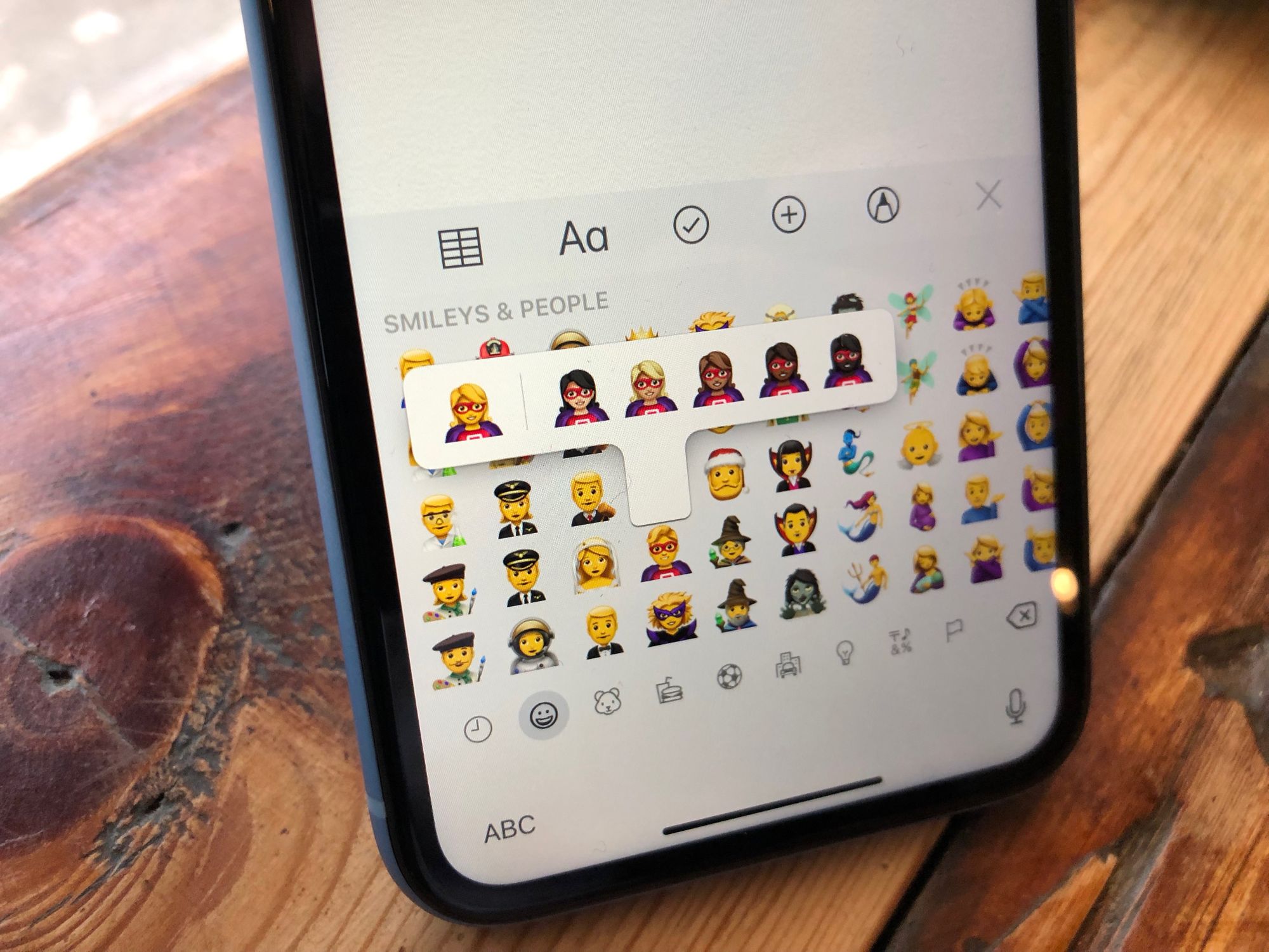 At last, redheads are here. People with curly hair, white hair, and no hair are included too. Press and hold any of these new emojis to view skin tone options.