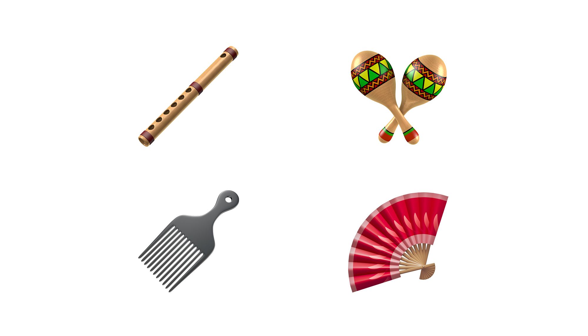 Finally, there are two new additions in both the โฝ Activity and ๐ก Objects categories - two musical instruments (a ๐ช Flute and ๐ช Maracas) and two appearance-focused items (a ๐ชฎ Hair Pick and a ๐ชญ Folding Hand Fan).