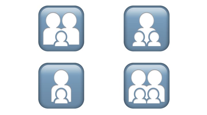 Instead of displaying colorful people emojis alongside one another, all of the family emojis now display different combinations of white non-gender-indicative silhouettes overlayed on a grey square icon.