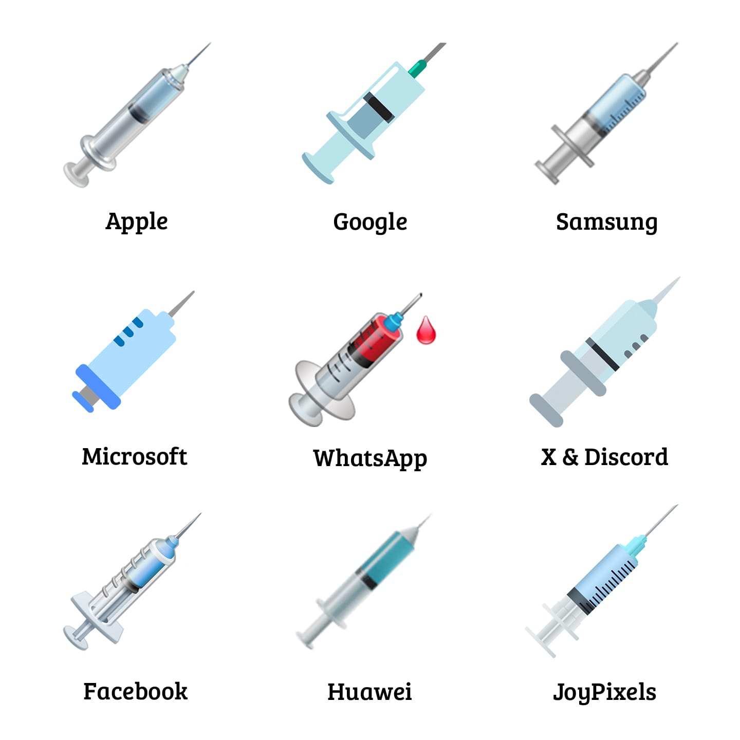 While the majority of vendors followed suit, not all have: at the time of writing, WhatsApp still displays blood in the barrel of the syringe.