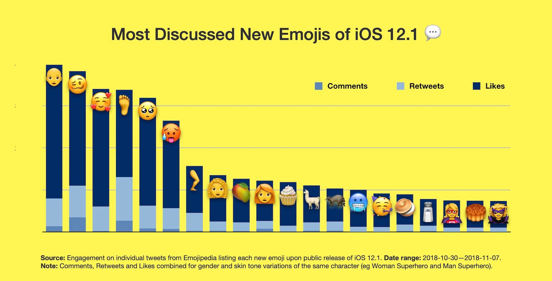 Measuring new emojis by engagement (likes, comments and retweets) on Twitter isn't necessarily an indication of how popular any emoji will be in real-world use, but it does give an insight into which emojis people consider interesting, notable or controversial in some way.