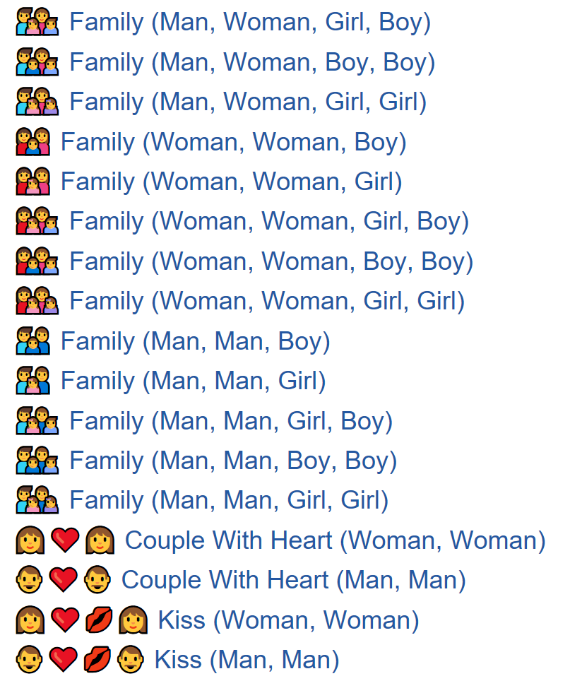 In addition to the Unicode 9.0 emoji candidates, a variety of family combinations are supported too. These include families with two moms, two dads, or one of each parent.