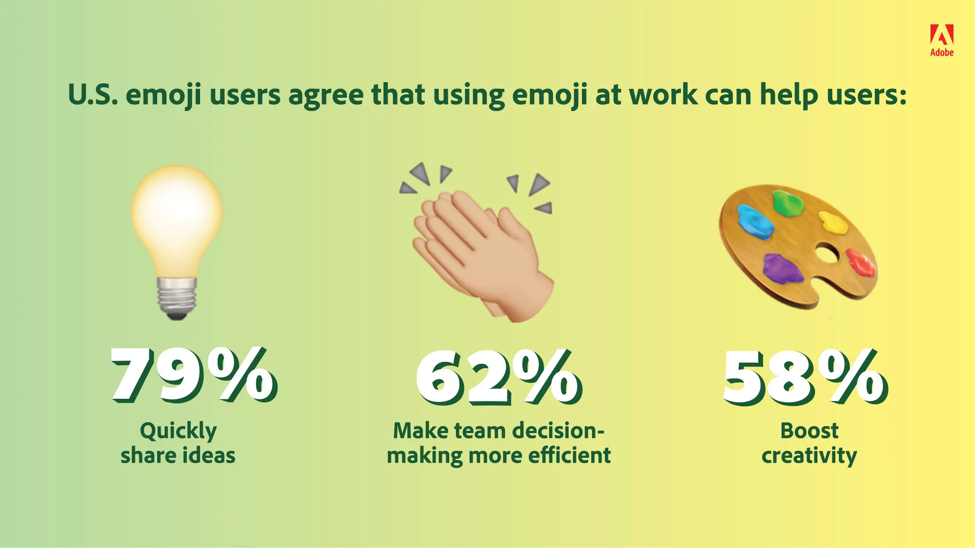 Additionally, the report said that U.S. emoji users agree that using emojis at work can help quickly share ideas in 79% of cases, make team decision-making more efficient 62% of the time, and boost creativity in 58% of instances.