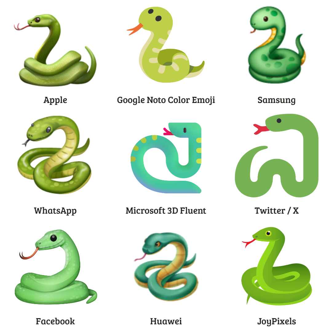 The 🐍 Snake takes a couple of different forms and variations depending on the vendor, but most of the time it’s depicted as a yellow-greenish coiled serpent facing left with a forked tongue.