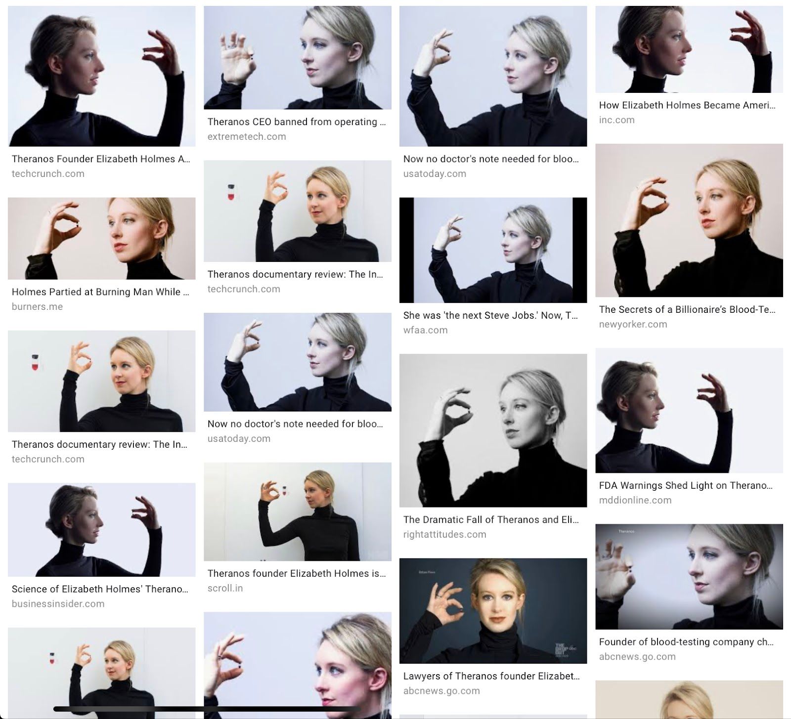 One particularly memorable image of this pinching gesture, is what seems like every single promotional photo Elizabeth Holmes, the disgraced founder and CEO of the biotech company Theranos. In these photos she wears a black turtleneck and pinches a tiny vial of blood. Unbelievable power in such a tiny package, she seems to indicate with her hand. And, yes, it is literally unbelievable because, in fact, it is not to be believed. Tavi Gevinson famously posted a video of herself doing a Holmes impression, hand in that same gesture. Holmes also inspired countless 2019 Halloween costumes (she was blamed for a black turtleneck shortage). The hand gesture was a necessary part of the costume.