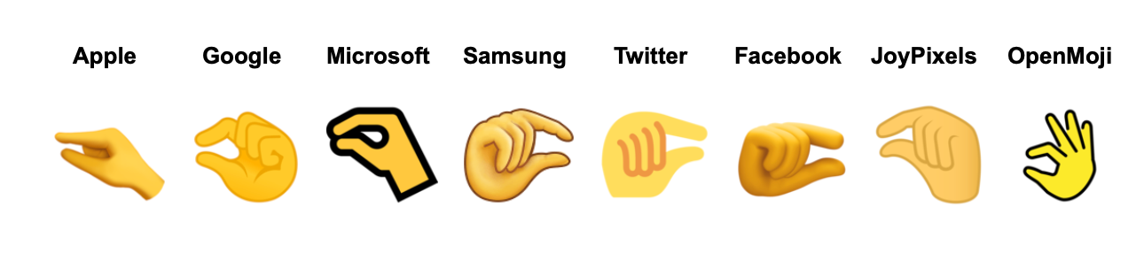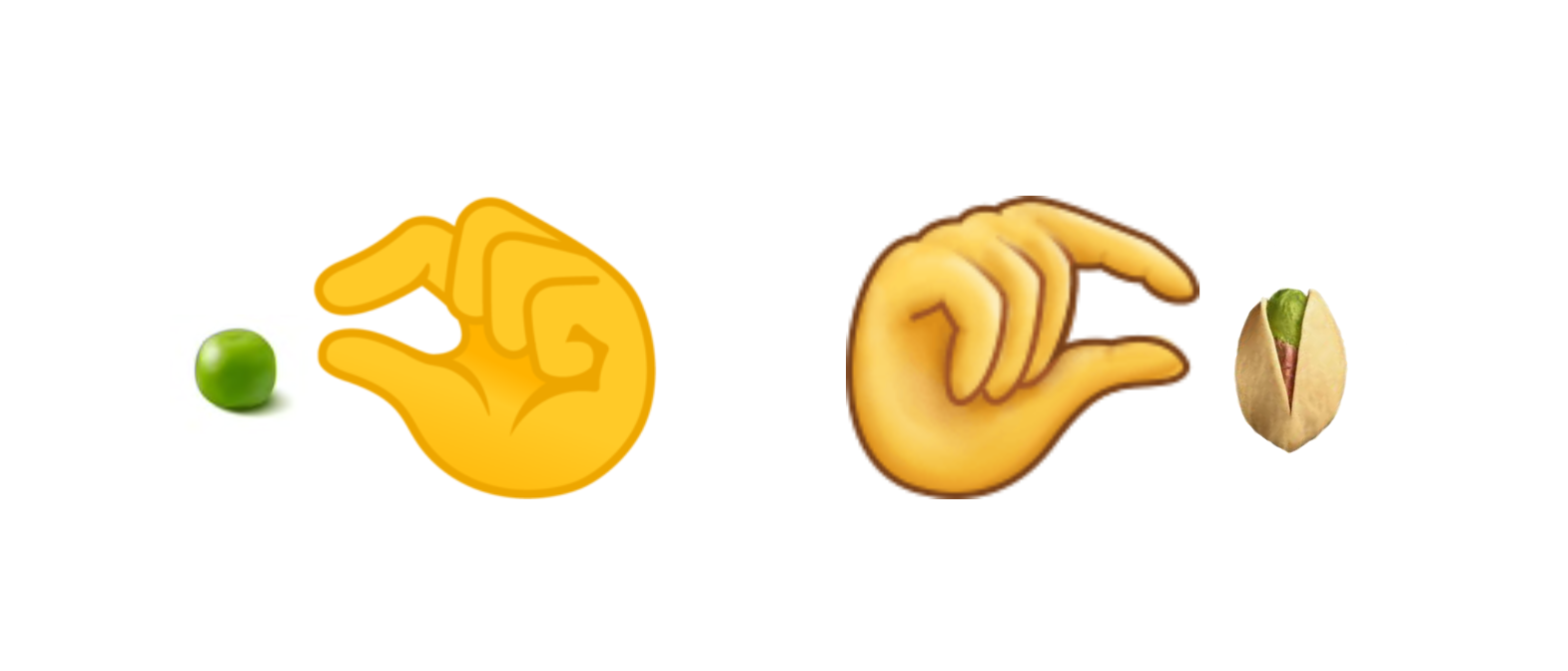 Looking at the designs across platforms, it could be argued that there’s a slight change to the meaning if there’s a pea-sized space between the index finger and thumb versus a pistachio-sized space. The latter would represent a slightly bigger thing. It might not make as significant of a difference when you shrink it down to emoji size, though.