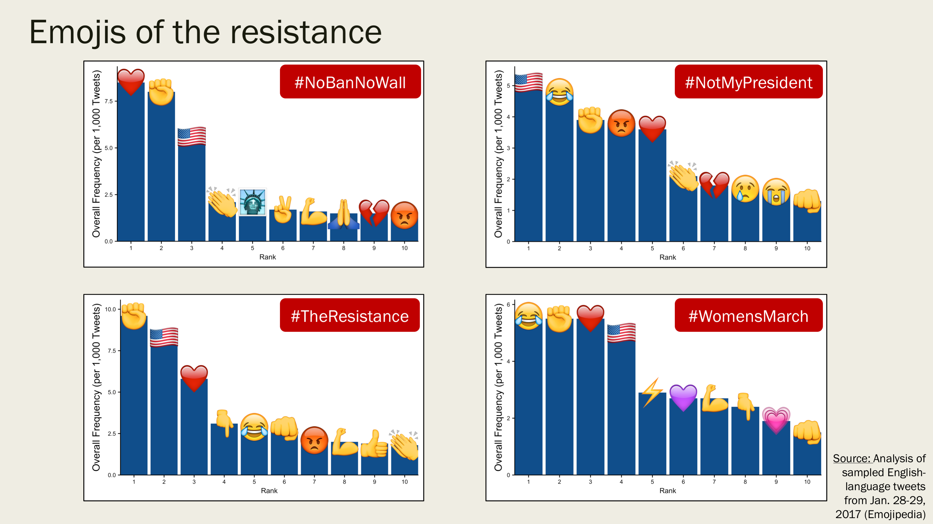 Above, I’ve listed the top five emojis for each of the protest-related hashtags. (Also, for comparison, I’ve provided data for an assortment of other topics - ranging from politics to fashion to sports - that I’ve been monitoring over the past few months.)