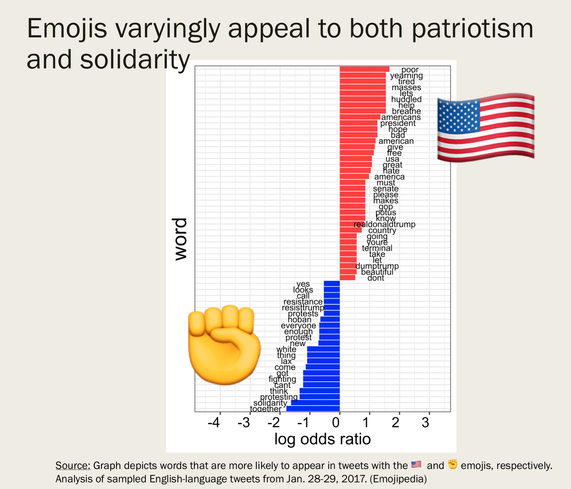 Can we quantify how people use emojis to express different forms of protest? Above, we compare word counts in tweets with 🇺🇸 and tweets with ✊. We express the results in terms of log odds ratio which is a measure of how much more often a word is used with a given emoji.