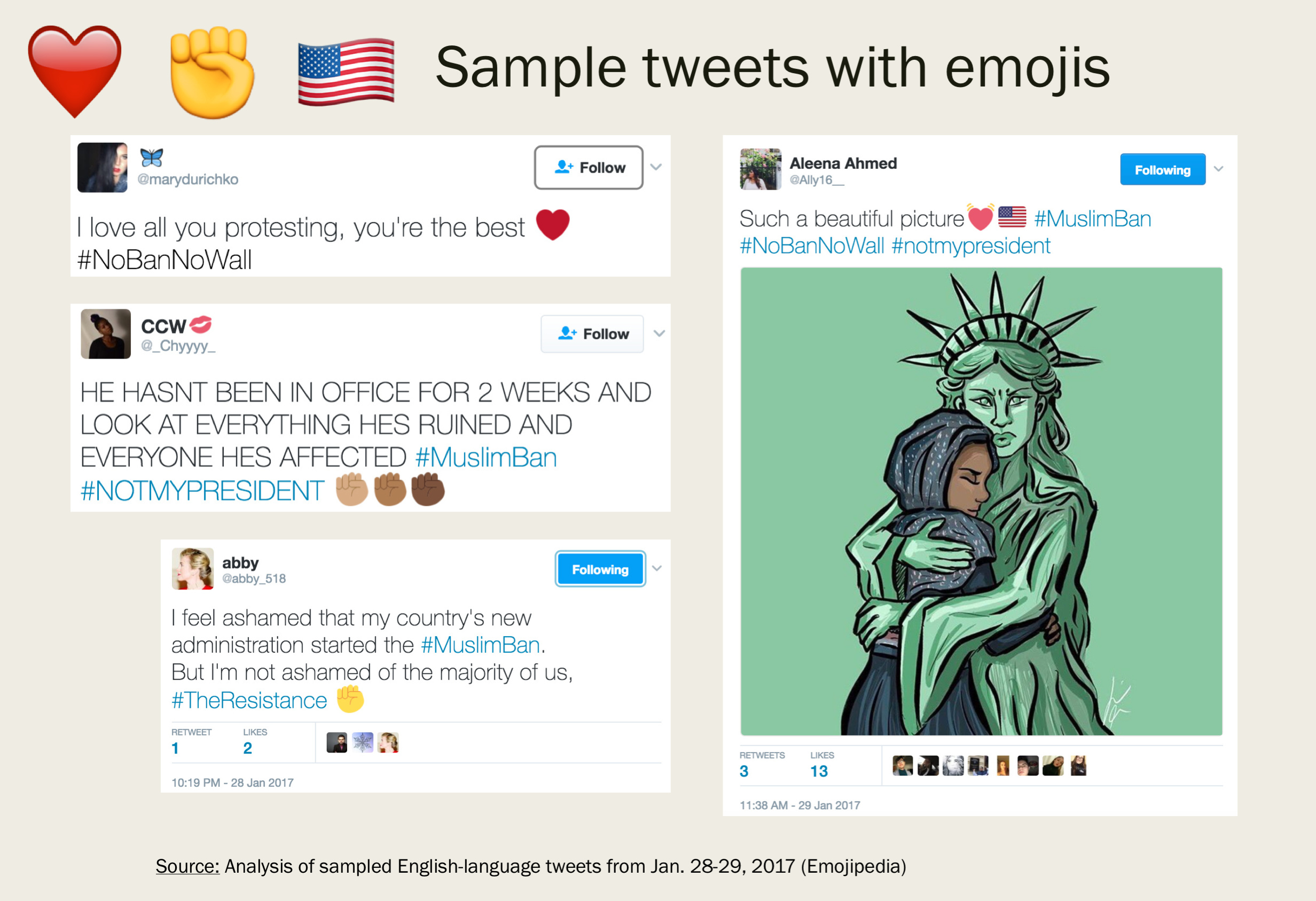 We also find, curiously, that the 😭 loudly crying emoji, contrary to the assertions of many teenagers who argue that this should only used sarcastically, is indeed used seriously as well. For example, we find “Crushed. It's only been one week 😭. #notmypresident” and also “I am so sad by what our so called President has done to our world in 8 short days he has been in office😭😭 #NoBanNoWall #NotMyPresident.”