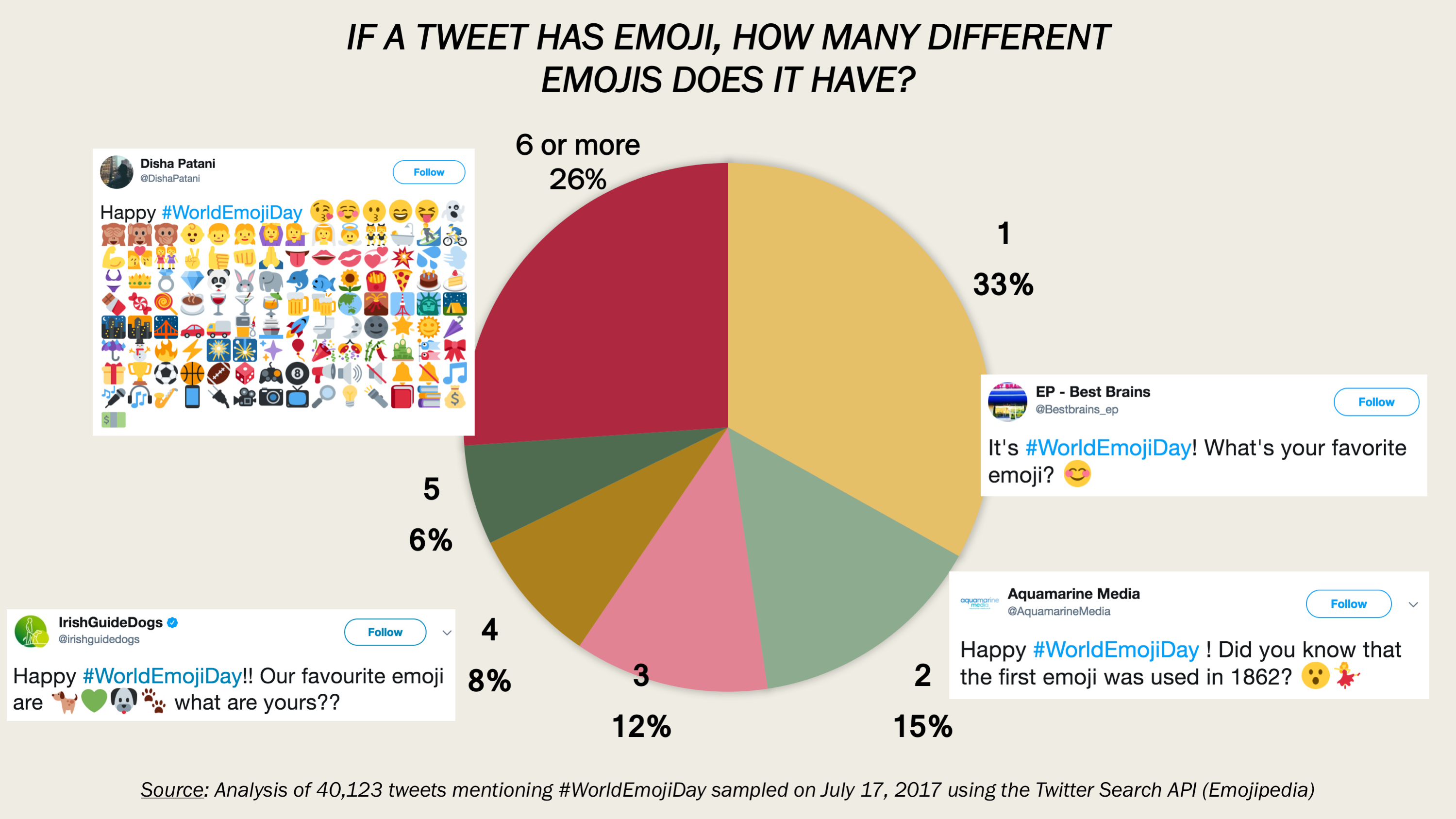One third (33%) of tweets with emojis mentioning #WorldEmojiDay contain one distinct emoji, while another 15% contain two different emojis. The remaining 52% of tweets contain three or more unique emojis. Thus, we find that in contrast to typical emoji usage on Twitter - where emojis are often used to modulate emotions and replace specific words - on World Emoji Day, people are more likely to be a little extra in their emoji usage. In fact, over a quarter of tweets (26%) include six or more emojis!