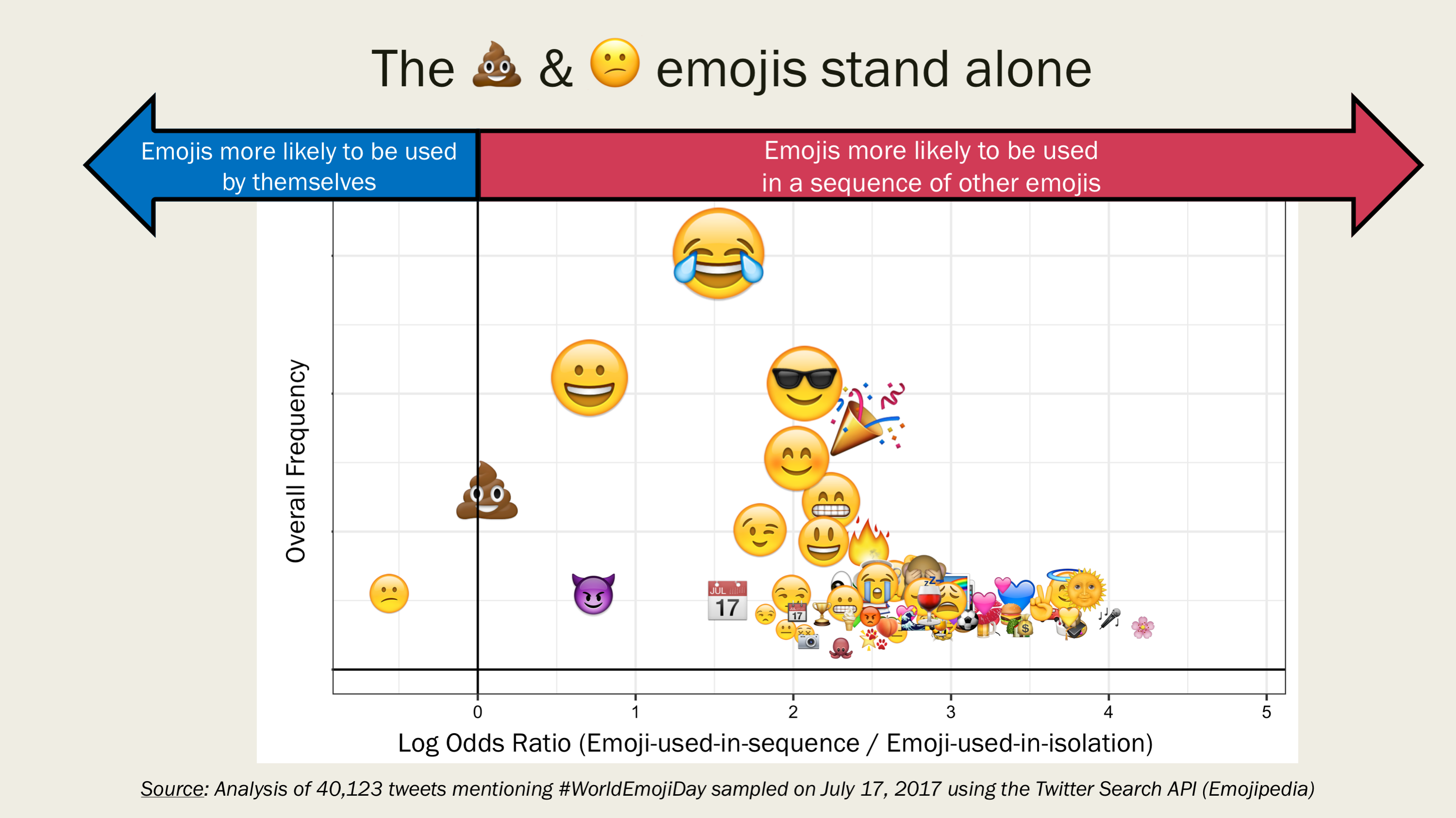 In our dataset, most tweets contain multiple emojis so it shouldn't be surprising that almost all emojis are more likely to be used in a sequence versus by themselves. The two exceptions are ๐ confused face, which is the only emoji used more often alone than with other emojis, and ๐ฉ pile of poo which is used just as frequently alone as with other emojis. As you move to the right in the above plot, emojis become even more likely to be used in sequence and less likely to be used alone.