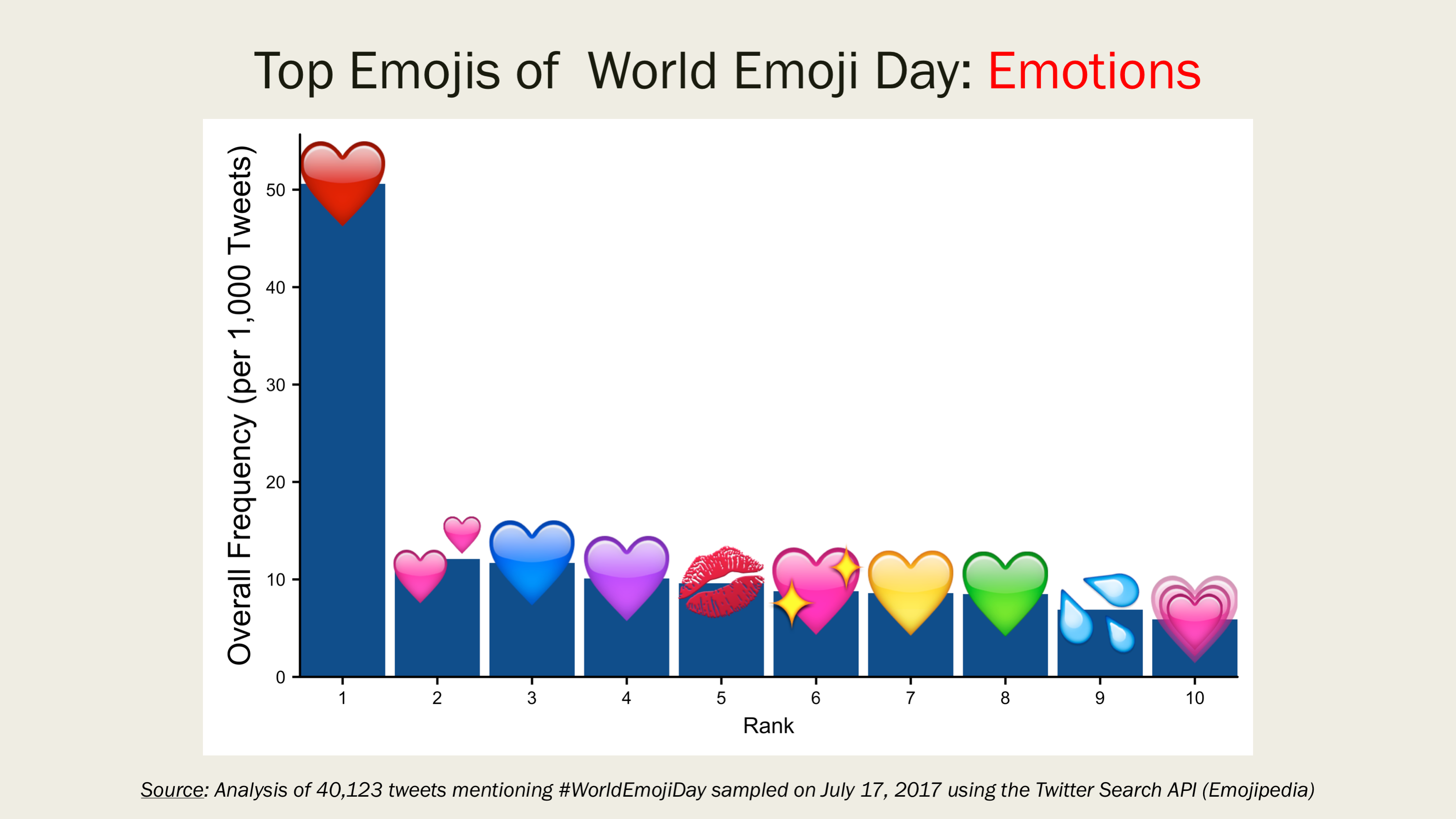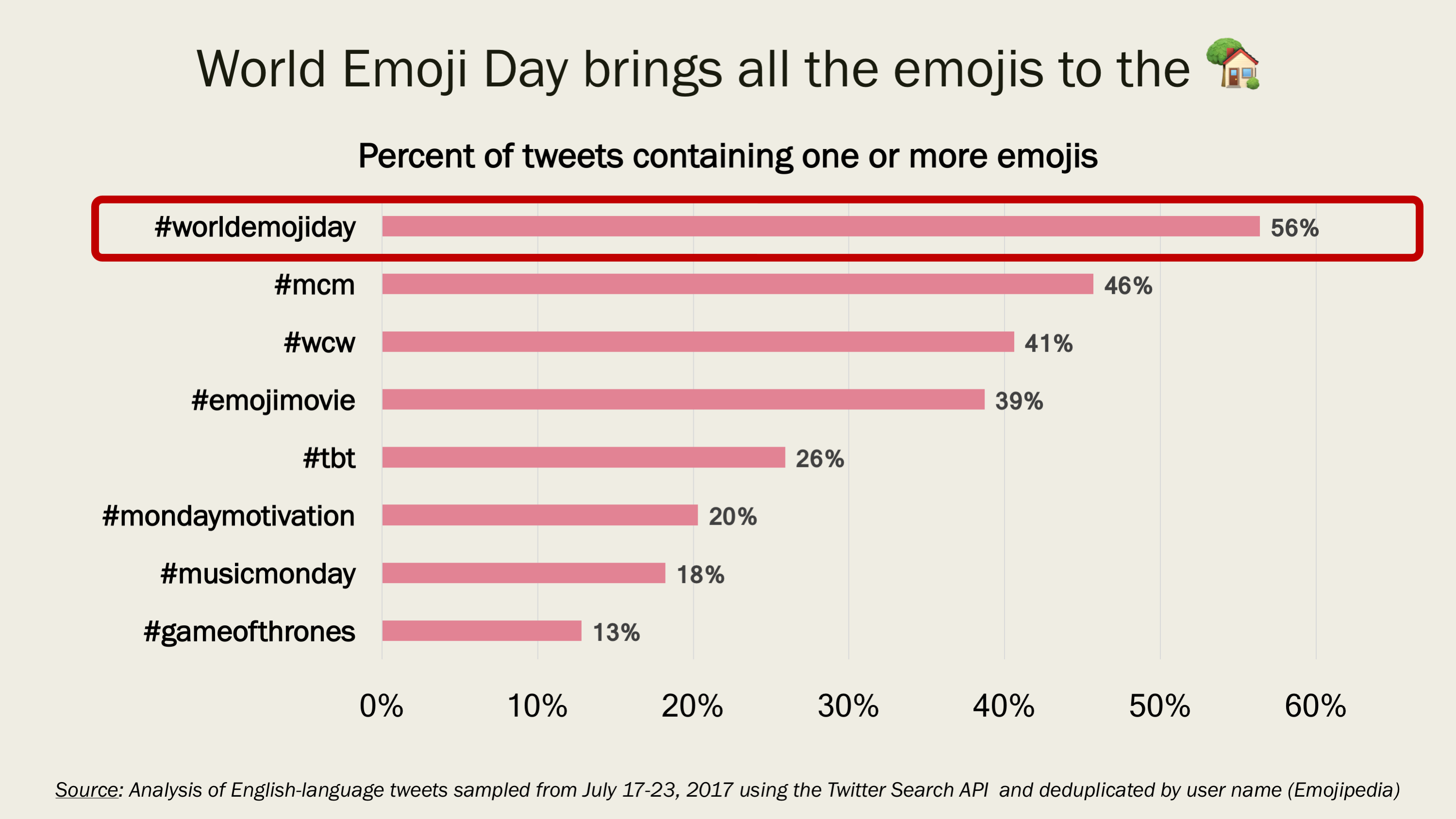 A record 56% of tweets with the #WorldEmojiDay hashtag include one or more emojis. For reference, the percent of tweets including emojis is usually less than 20%, for a typical hashtag.