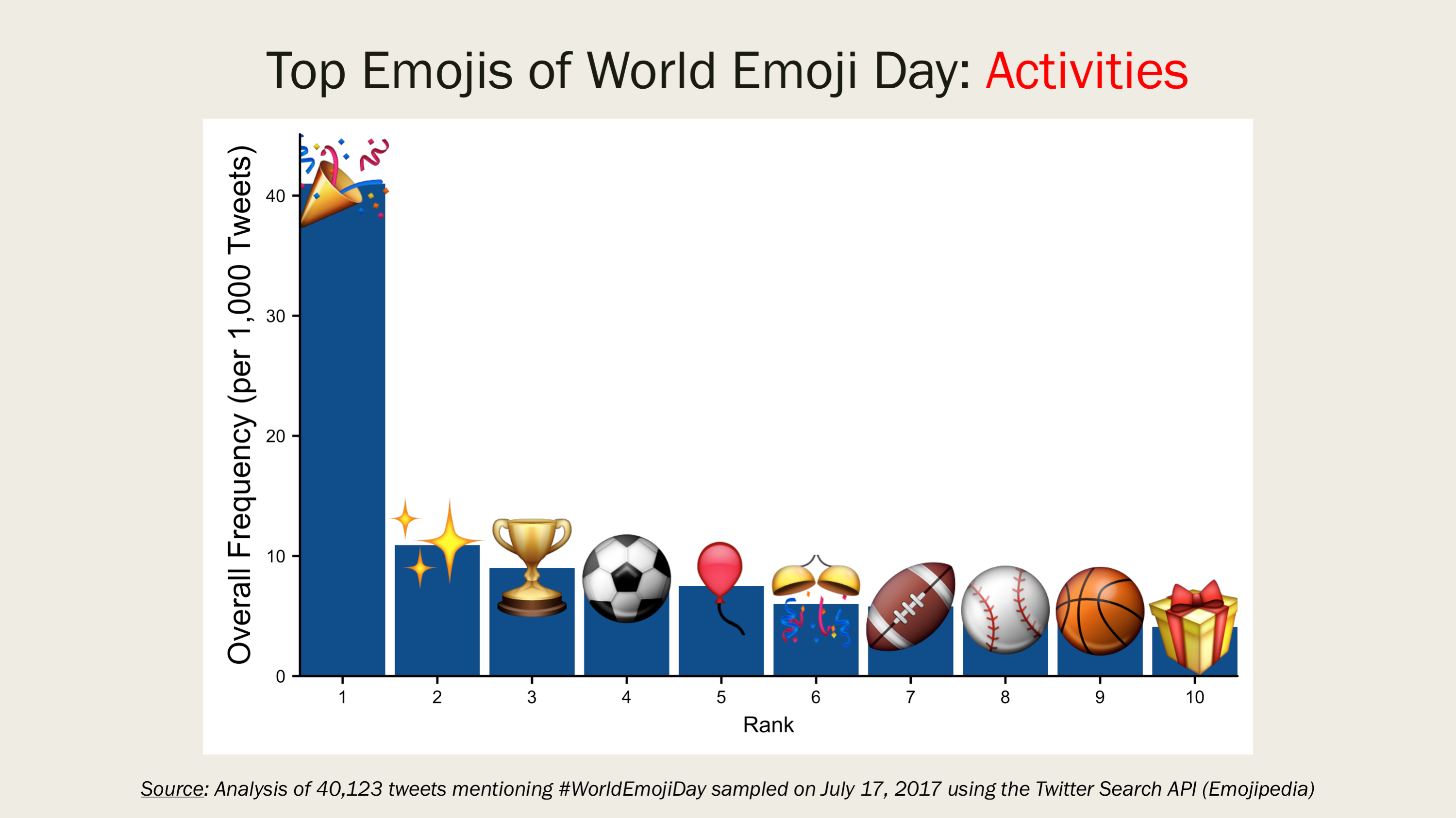 The top activities emoji by a strong margin is ๐ party popper, which makes sense given the celebratory air around World Emoji Day. Interestingly, โฝ soccer ball, ๐ American football, โพ๏ธ baseball, and ๐ basketball also show up in the top ten. Most of these are used by various sports teams and enthusiasts to commemorate World Emoji Day, for example: